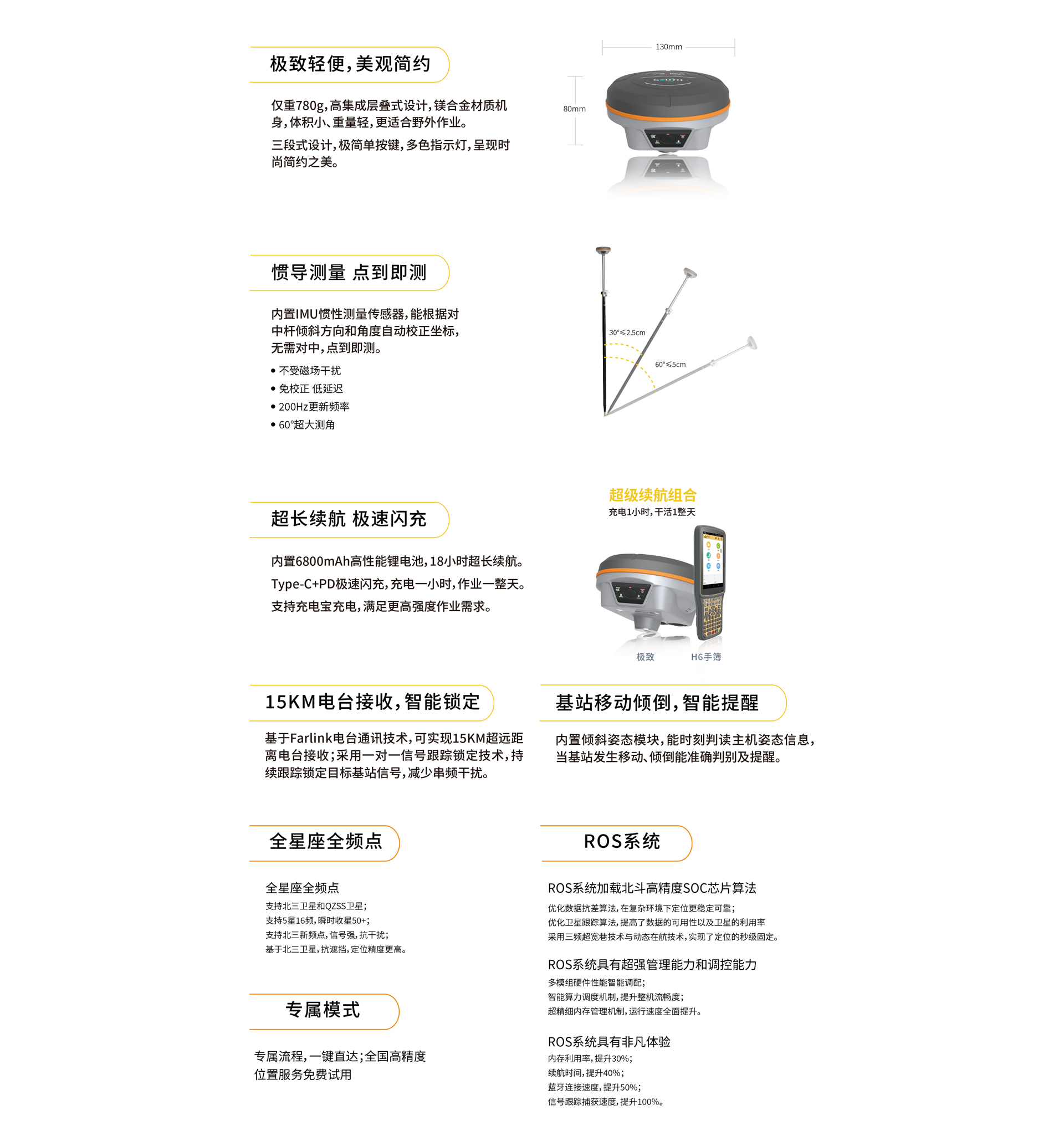 內(nèi)置IMU慣性測量傳感器,能根據(jù)對(duì)中桿傾斜方向和角度自動(dòng)校正坐標(biāo),無需對(duì)中,點(diǎn)到即測。